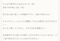 773です🐼 昨日休んだじゃん YとKちゃんがきてくれたらしくて今回はKちゃんが指名してきてくれたらしくて 店長から鬼ラインと電話きてたのに 寝落ちしてた最悪すぎるwwwww おらんやん❗️ってKちゃんからもラインきてたから起きてすぐ電話したら ポンコツやん って言われてその通りすぎてしんだwww Yとも話せたけど 疲れて寝落ちしてた話したら わかるよ、わかる🎶 とかめちゃ適当こいとるもんwwww てか連絡してくれや❗️ まさかそんなど平日に一緒に飲んでると思わん❗️ だって年始までずっと一緒に飲んでたとか言ってたから どんだけ仲良いねん まじでごめん😭 もう休んだらあかんってことやo(`ω´ )o笑 やすらぎ楽しみにしてますぅ ほんとごめんね 見てるか知らんけどwwww フリーでお店入ってくれてありがとう! お店使ってくれるのは嬉しいです🐼☆ 明日きてって言ったのに 行くわけねえだろ とか言われて墓🪦 可愛く寝ててすみません またの機会を楽しみにしております☺️ とゆーことで週の真ん中だね🌱 土曜日ほんとはライブなんだけど チケないから悩み中 高いしさ🎫 出番20分ぐらいだし 3万ぐらいで売ってたら行きますわ 出勤じゃないけど出勤することになるかも😭 ライブ行きたい 福利厚生 笑 アルフォートブラックサンダーキットカット 食べてる犯人はわたくしです 太るね 控えよっと🐷 毎朝寒くてベットから出れない時期きた 終わり じゃ☕️