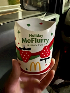 おはようございますみさきです🩵 右目にものもらいできた😭早く治ってほしい! そういやものもらいのこと三重だと「めぼ」「めんぼ」って言うんだけど愛知来てから通じなくて方言って知りました😂笑 写真ブレブレだけど苺オレオのフルーリー食べた🍓 美味しかった!