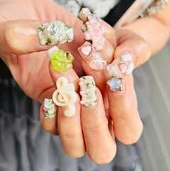 ねいる! ごてごて!かわいー💛 前回シンプル目だったからゴテゴテ復活してうれしい🐹🍀 でも昨日ダンベル握った時小指のパーツがでかくて薬指にささって痛かった😔 設計みす はたしてシンプルなネイルにする日はくるのか…