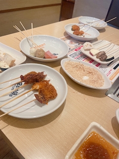 こんばんは🌙雪です お昼は串食べに行ってきた🩷 久しぶりにここ行った! れんこんとチーズドッグ?ばっかり食べてた🤣🤣 太るもんばっかり食べちゃうわ全くもう😇😇 カルディで買った1個300円の高級コーヒーゼリー、 後で食べる!(何の報告や) 今日はお休みになります😌
